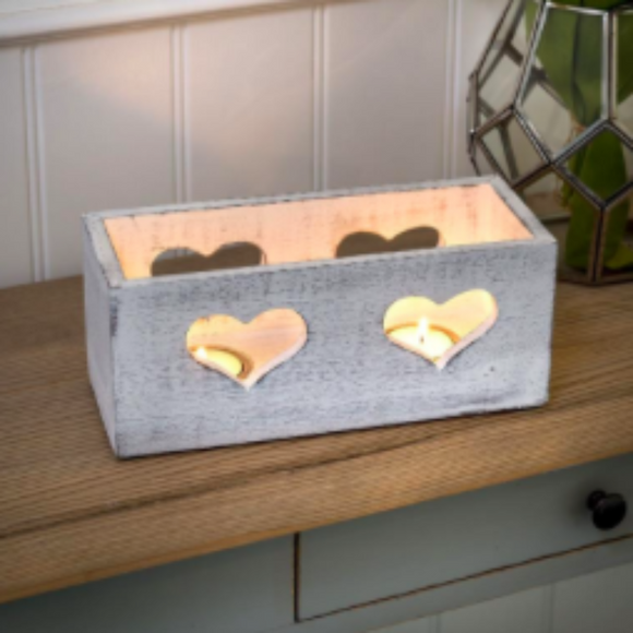 - Made from mango wood by local artisans with two heart cut-outs to let the light of the candles shine through!